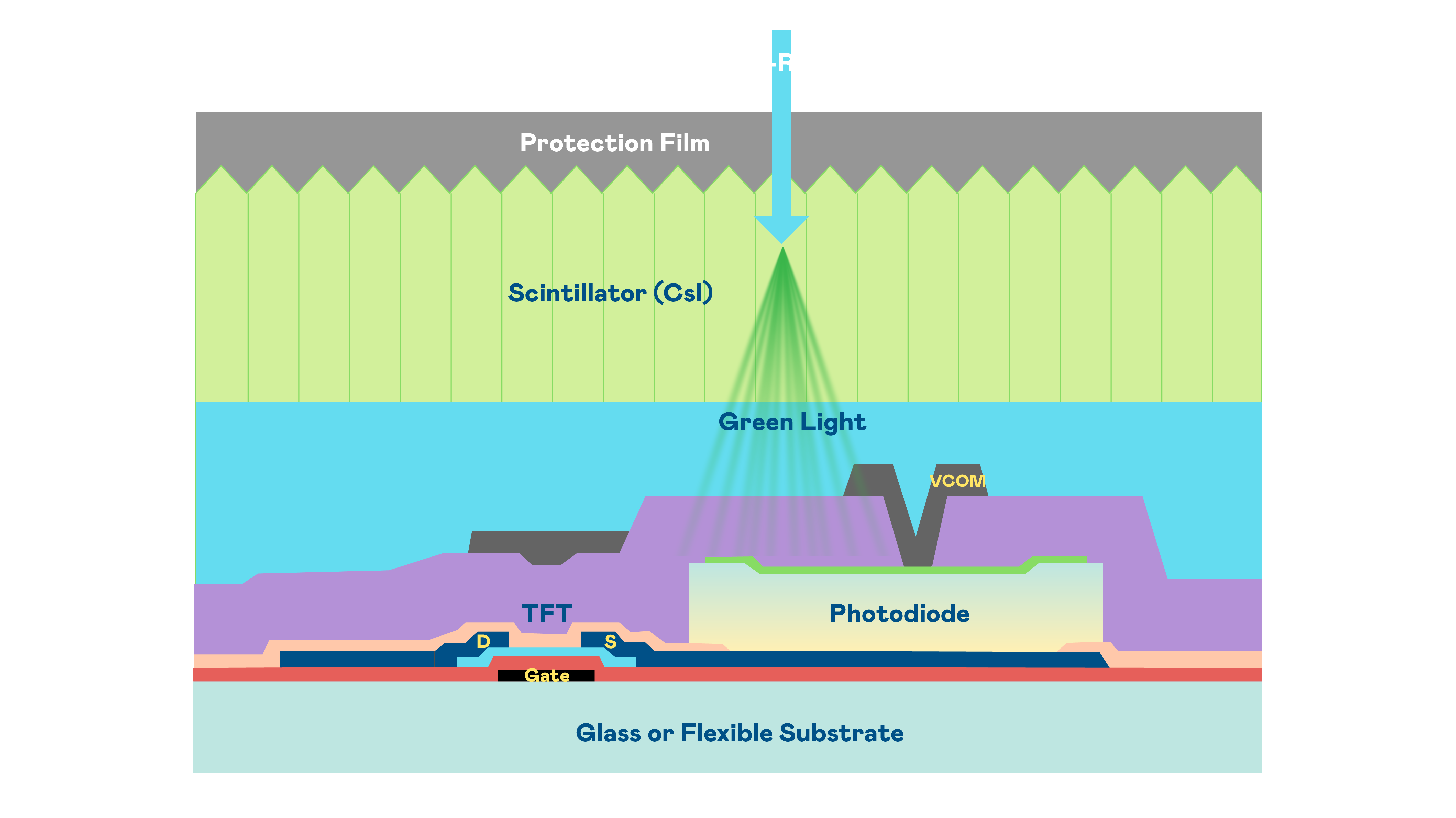 AG视讯的X光影像感测阵列使用薄膜电晶体 (TFT) 作为每个像素的读取开关,搭配光电二极体(Photodiode)的光电转换元件,用以感测X光影像讯号。